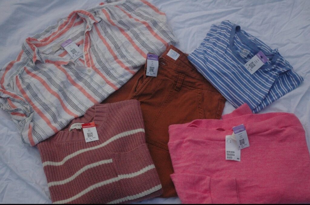 #1) The money: I paid $29 for the clothes in the picture. That comes out to $5.8 per piece. This haul included an H & H sweater with the tag still on, Time and True Cargo pants which run about $25, a Walmart dress, and a top from my favorite company, Loft. This, truly, is our biggest reason.